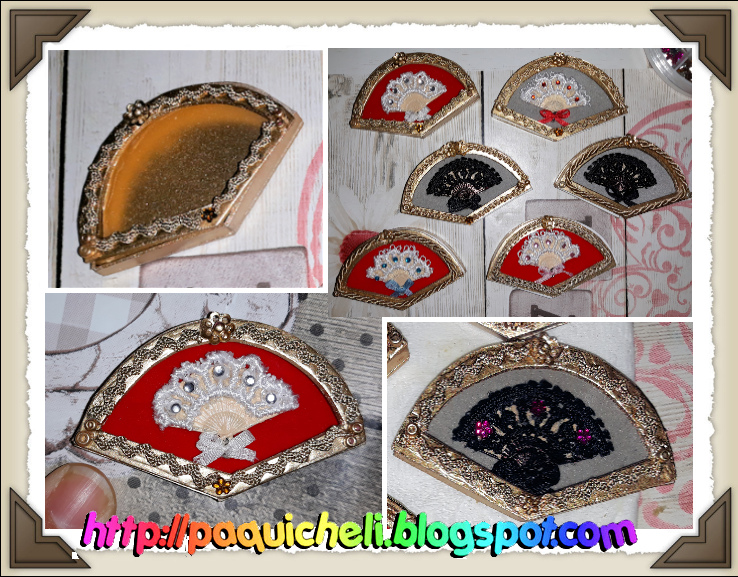 Luego pinté todas las piezas con spray dorado, y una vez secas, les puse un trocito de papel de terciopelo, en rojo para los blancos y en gris para destacar los abanicos negros. Finalmente, les puse acetato y cerré la pieza, con una cinta dorada alrededor para disimular los fallos.